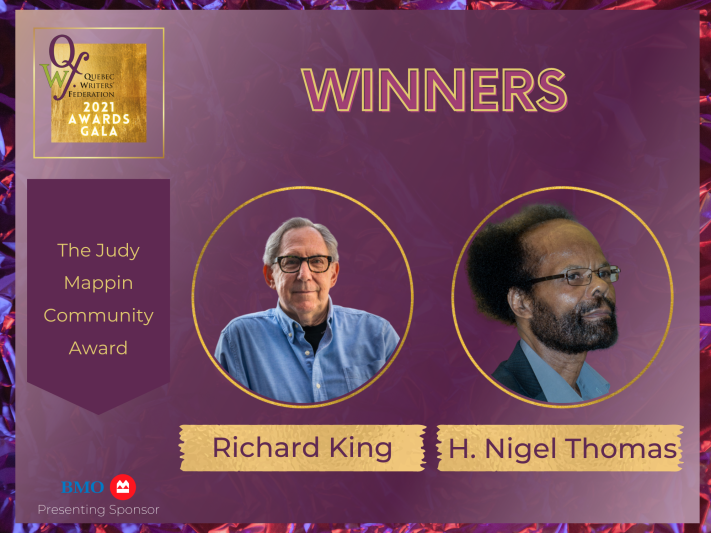 The QWF’s honorary 2021 Judy Mappin Community Award for outstanding contributions to English-language literature in Quebec was bestowed on bookseller Richard King, founder of Paragraphe Bookstore, and writer H. Nigel Thomas, whose teaching and founding of Kola magazine has been transformational for Black writers in Quebec.