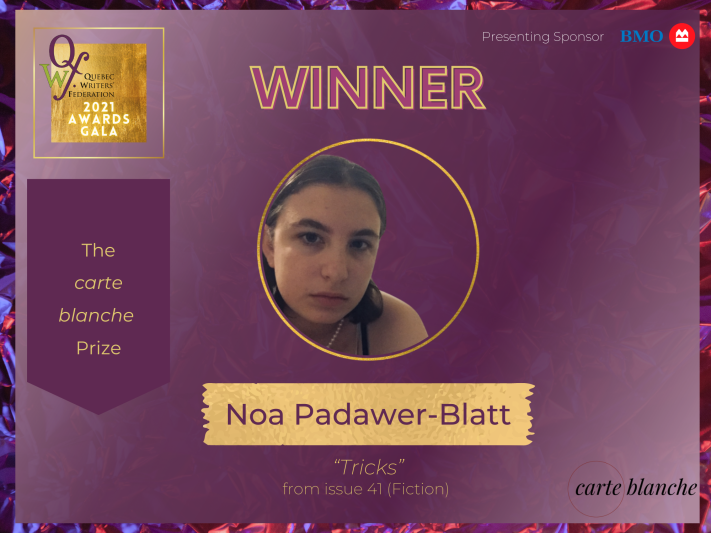 The carte blanche Prize for best contribution to QWF’s online magazine was awarded to Noa Padawer-Blatt, for Tricks (Issue 41).