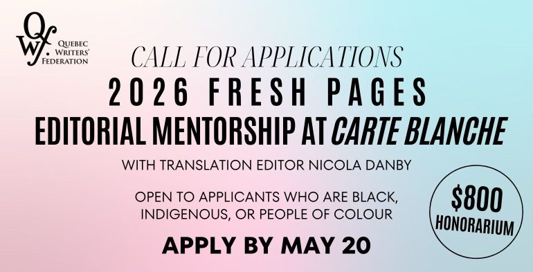 The mentorship will go to a Quebec-based writer with an interest in French-to-English translation or a Quebec-based literary translator. Applicants must not have previously worked as an editor for a professional magazine or literary journal. They do need need to be current QWF members.