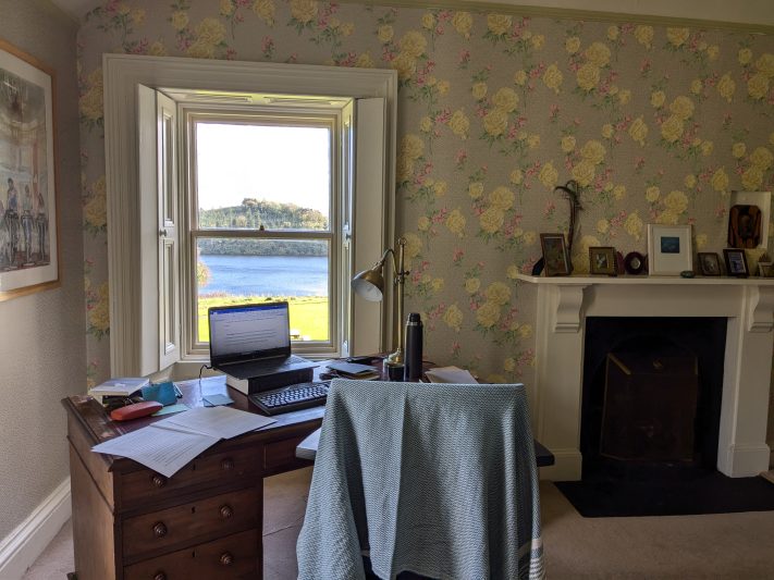 As I write this, I’ve been here at the Tyrone Guthrie Centre at Annaghmakerrig for nearly two weeks. A rhythm has been established. I wake up and open the big wooden shutters on the windows in my room, which looks out the front of the “Big House” onto the lake. Downstairs for coffee, and then back up to my desk. At ten o’clock, a rotating cast of characters convene downstairs again for a cold dip in the lake—I was thrilled to get here and find myself among so many people game for daily frigid swims. I got hooked, haven’t yet missed a day. And then I spend the rest of my day at my desk, writing and reading and thinking, spreading my notes out over the carpet, before taking a walk in the forest or along the narrow roads.