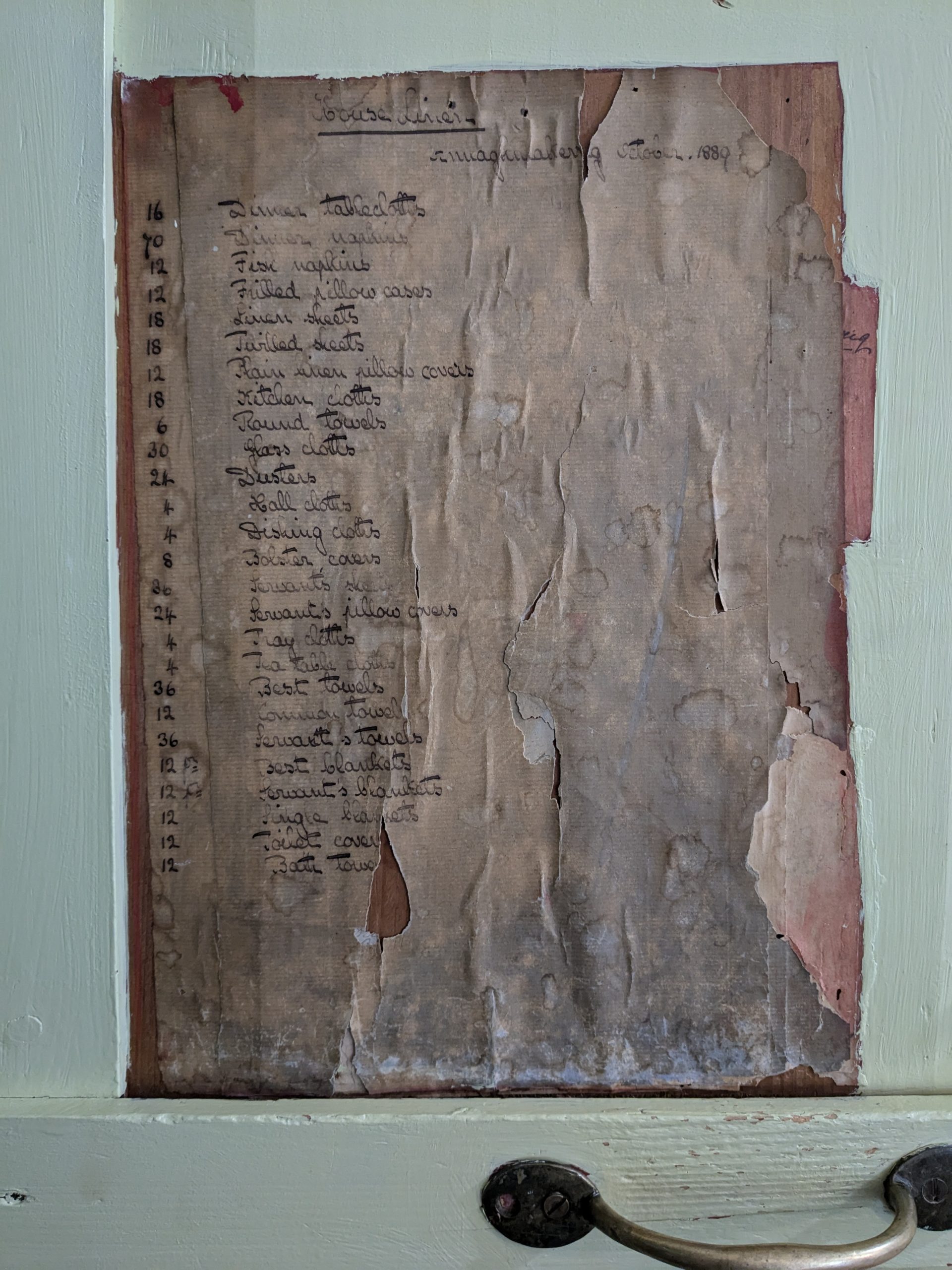 Because there’s really nowhere to go, apart from little walks in the forest, and nothing to do, gloriously, but work and think and talk with each other, we lavish the house with our attention. The hallways and rooms are full of art and artifacts. Every time I leave my room, I notice something new, or I pass another resident pulled up short in the hallway or the stairwell, examining something I’d missed. On the door to my bathroom, they have painted around a laundry list dated 1889. There are curious little insets and details everywhere in the walls. One night, someone convenes the few of us lingering at the table after dinner in the back hallway to look at a funny engraving hung above the fire extinguisher. We crowd in the narrow space and elect someone to read it aloud, squinting at the letters. The house has been changed only as much as strictly necessary, the soul not chased out of it by needless renovations. They have found a way to preserve it without trapping it in amber, a delicate balance achieved all too rarely, and so it still feels alive in a way I found almost spooky at first but have come to find comforting.