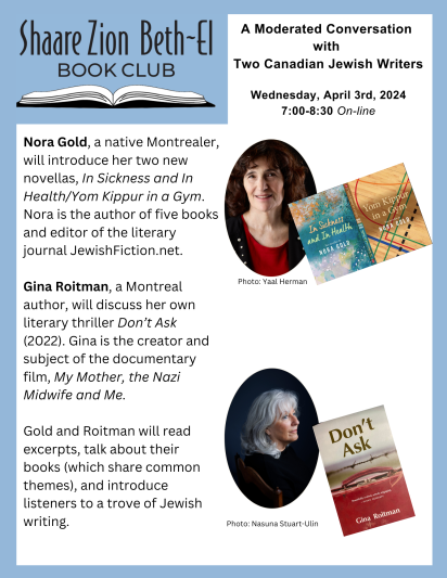Nora Gold, a native Montrealer, will introduce her two new novellas, In Sickness and In Health and Yom Kippur in a Gym. Nora is the author of five books and editor of the literary journal JewishFiction.net.