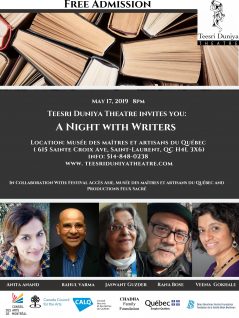 To compliment the exhibition BRIDGES OF HOPE presented at the Musée des maîtres et artisans du Québec, Festival Accès Asie and Teesri Duniya Theatre bring you A NIGHT WITH WRITERS, a free literary event.