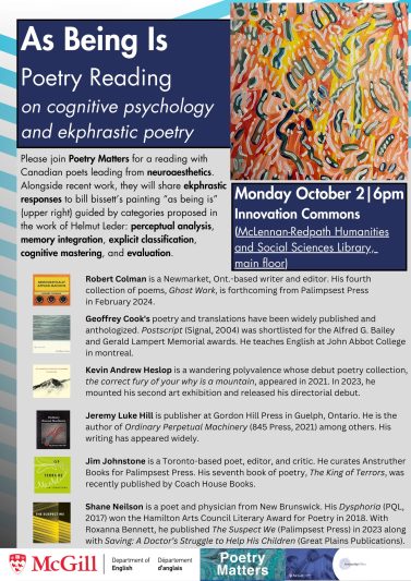 Please join Poetry Matters for a reading with Canadian poets leading from neuroaesthetics. Alongside recent work, they will share ekphrastic responses to bill bissett’s painting “as being is” guided by cognitive psychology.
