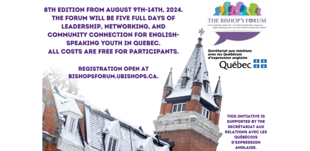 Now in its 8th edition, the Bishop’s Forum offers a 5-day experience as an introduction to civic engagement along with leadership and networking opportunities for English-speakers aged 18-26. Participants from across the province will meet speakers from various domains and will engage in workshops which address topics such as mental health, public administration, and financial literacy.