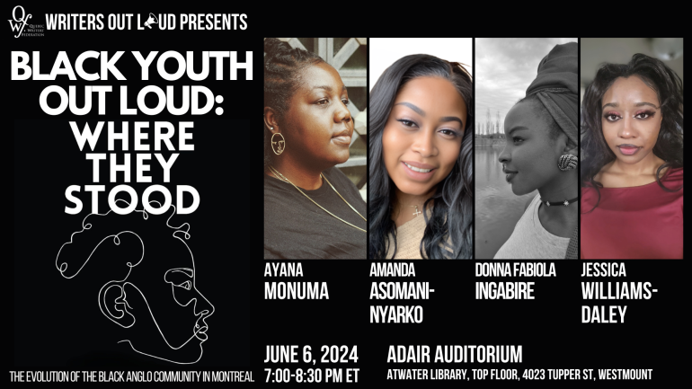 Join us for Black Youth Out Loud: Where They Stood. Three young writers—Amanda Asomani-Nyarko, Donna Fabiola Ingabire, and Jessica Williams-Daley—sit down with moderator Ayana Monuma to discuss their work in Where They Stood: The Evolution of the Black Anglo Community in Montreal (Linda Leith Publishing, 2023), an anthology produced by the Black Community Resource Centre detailing the cultural, political, and social history of Montreal’s Black Anglo community. A Q&A with the audience and a reception with refreshments will follow the discussion.
