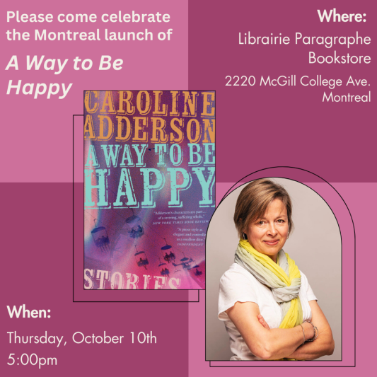 Vancouver author Caroline Adderson will be reading from her Giller long-listed collection of short stories A Way to Be Happy at Librairie Paragraphe, 2220 McGill College Avenue, Thursday October 10th at 5pm.