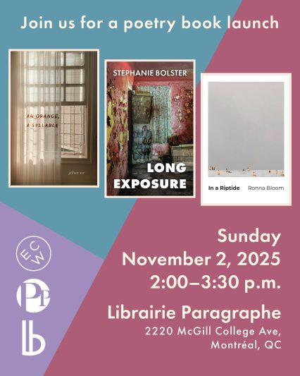 Join us for a poetry book launch, celebrating the release of An Orange, a Syllable by Gillian Sze, Long Exposure by Stephanie Bolster, and In a Rip Tide by Ronna Bloom.