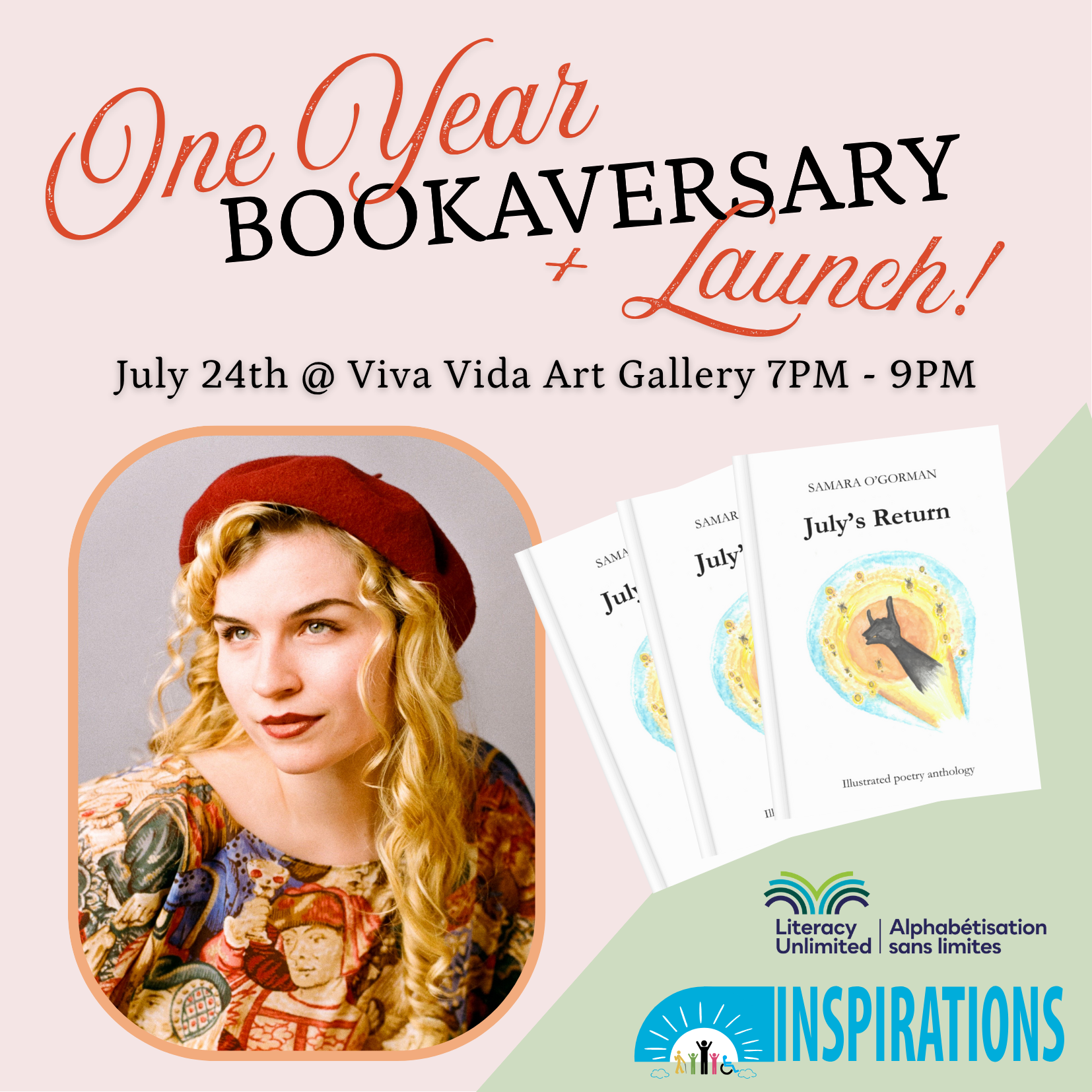 Join us on the evening of Thursday, July 24th, at Viva Vida Art Gallery for the Bookaversary + Launch of July’s Return, a pocketbook anthology from Samara O’Gorman. The night will feature an intimate live reading, a Q&A led by Wendy Singer (Inspirations News), book signings, and a conversation with Julia Asselstine (Literacy Unlimited) on emotional literacy.