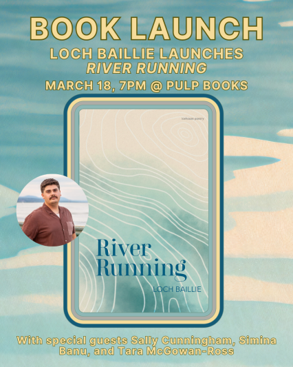 Join Loch Baillie for the launch of his first full-length collection of poetry, River Running, on Wednesday, March 18th at 7PM! Loch will be joined by special guests Simina Banu, Tara McGowan-Ross, and Sally Cunningham.