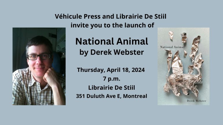 Librairie De Stiil and Véhicule Press invite you to the launch of Derek Webster’s new collection of poetry, National Animal. The event will start at 7 p.m. and feature readings and conversation, and is free and open to all. Refreshments will be served.