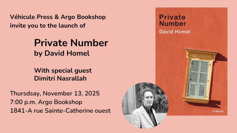 Véhicule Press and Argo Bookshop invite you to the launch of David Homel’s new novel Private Number. The event will feature readings from the book as well as conversation with Esplanade Books editor Dimitri Nasrallah. This event is free, but space is limited, so please RSVP on TicketSource. Masks are not required, but will be provided at the door.