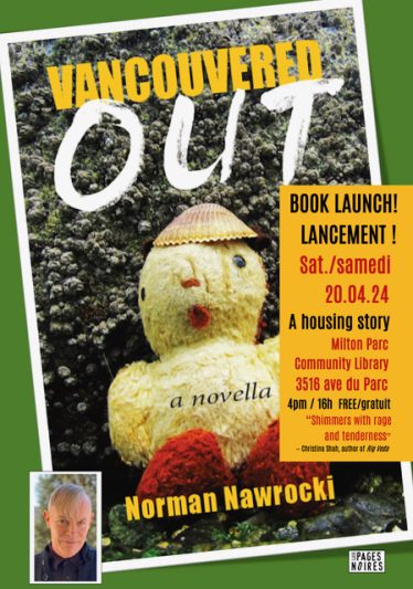 Acclaimed Montreal author Norman Nawrocki launches his exciting and timely new novella, Vancouvered Out, Saturday April 20, 2024 at the Milton-Parc Community Library, 3516 ave du Parc, Montreal, H2X 2H7. The 4pm launch is free.