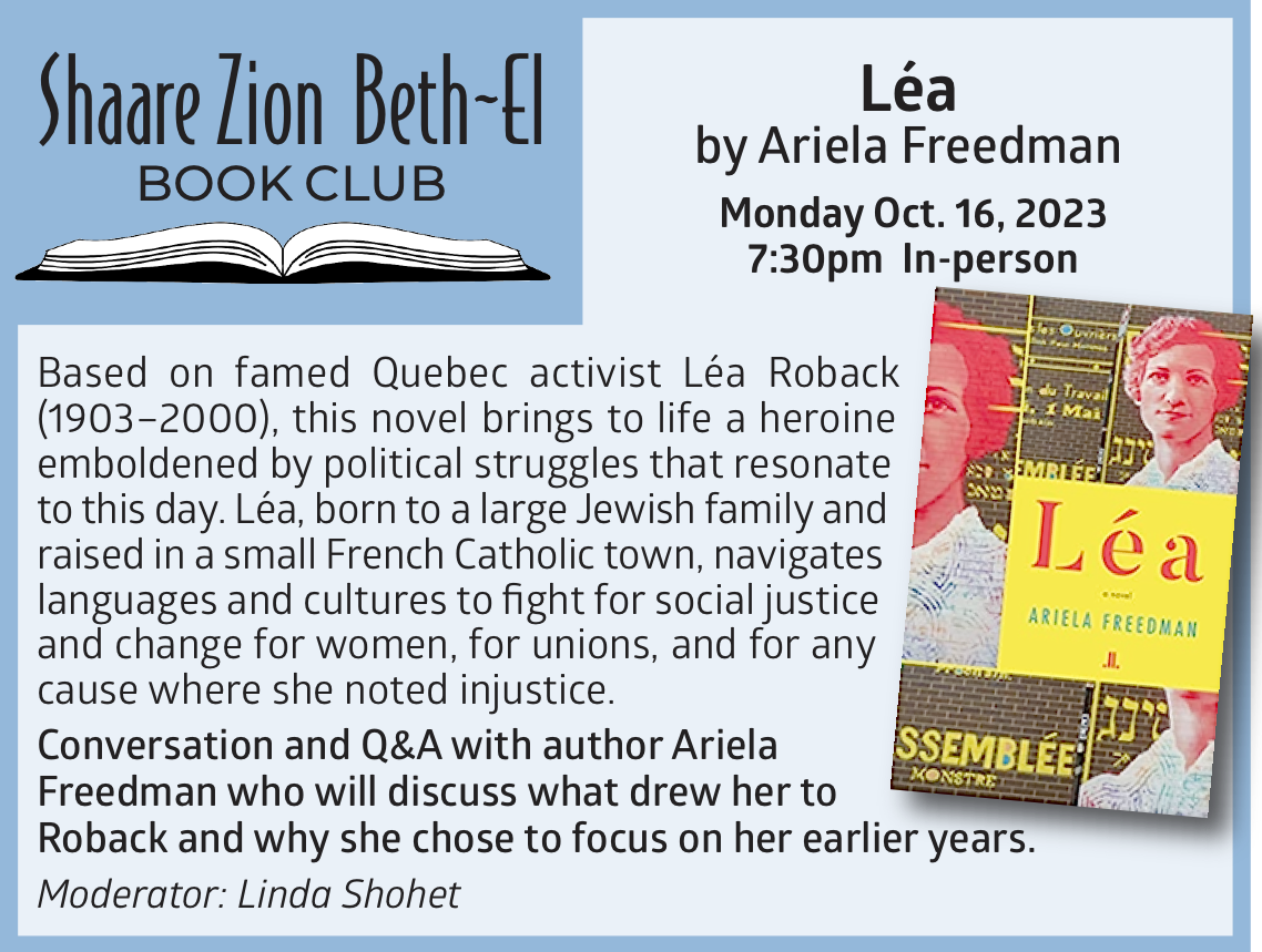 A conversation and Q & A with Ariela Freedman about her most recent novel, Léa, moderated by Linda Shohet. Based on famed Quebec activist Léa Roback (1903-2000), the novel brings to life a heroine emboldened by political struggles that resonate to this day. Léa, born to a large Jewish family and raised in a small French Catholic town, navigates languages and cultures to fight for social justice and change for women, for unions, and for any cause where she noted injustice. Ariela will discuss what drew her to Roback, why she chose to focus on her early years, and why Roback remains a revered figure in Quebec social justice circles.