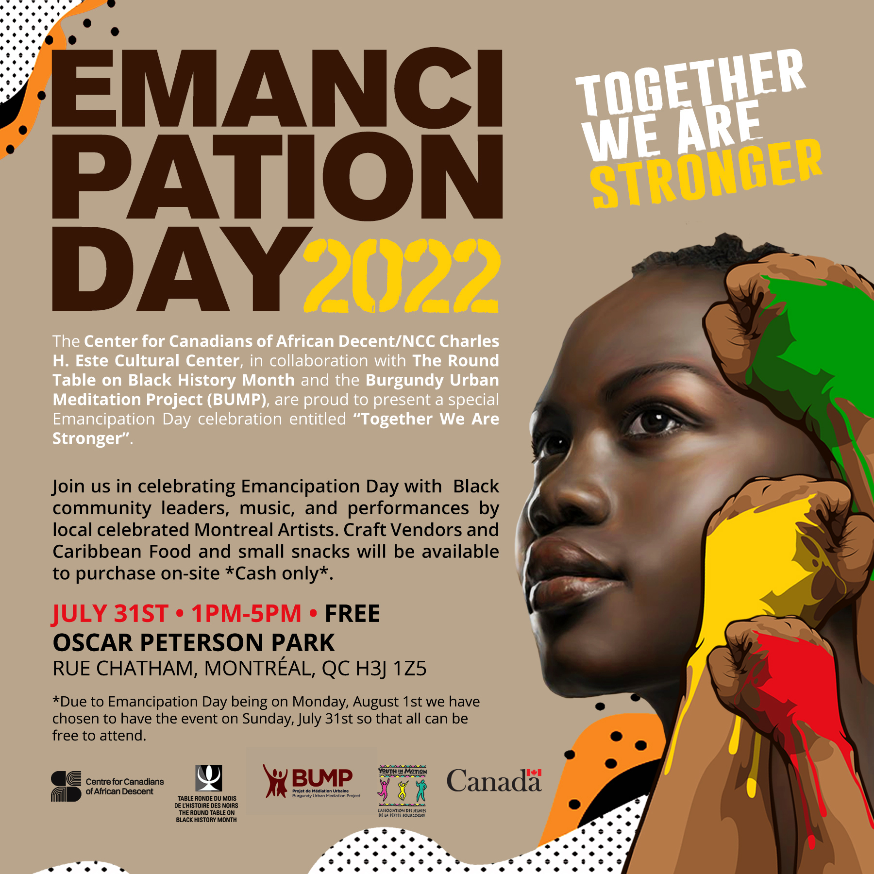 Come and enjoy a fun-filled afternoon with Black Community leaders, music, craft vendors, Caribbean food, and performances by local Montreal artists.