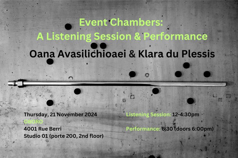 We are thrilled to invite you to a special and unique event around Oana Avasilichioaei and Klara du Plessis’s expansive projects, Chambersonic and Post-Mortem of the Event. From noon to 4:30 pm, stop by to listen and experience the sound installations. In the evening at 6:30 pm, attend a live performance. Books will be available for purchase. Celebratory drinks will be served after the performance.