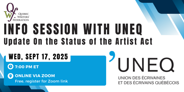 In partnership with QWF, the Union des écrivaines et des écrivains québécois (UNEQ) will be leading a virtual information session in English for writers to learn more about UNEQ and their role in negotiating collective agreements for writers in Quebec.
