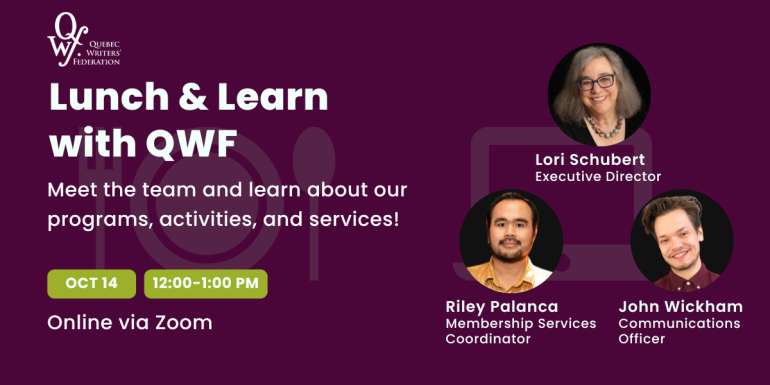 Lori Schubert (Executive Director) will explain QWF programs and services for more established writers, including the Writers in the Community program, the Hire a Writer Directory, and the QWF Awards.