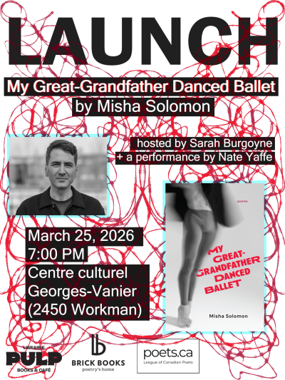 Join Misha Solomon in launching his highly-anticipated poetry debut, My Great-Grandfather Danced Ballet at the Centre Culturel Georges-Vanier on March 25th at 7PM! Hosted by Sarah Burgoyne and featuring a performance by Nate Yaffe. Copies of the book will be available for purchase at the event.