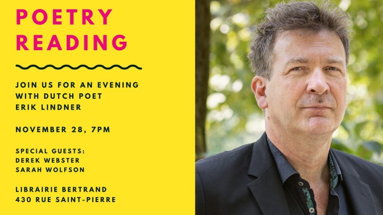 Véhicule Press, Librarie Bertrand, and the Dutch Foundation for Literature invite you to a poetry reading by Erik Lindner, with special guests Derek Webster and Sarah Wolfson.