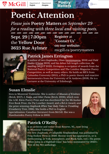Join Poetry Matters for a reading with poets Susan Elmslie, Patrick Errington, and Patrick O’Reilly