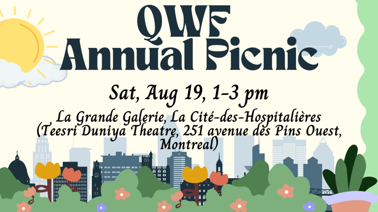The Quebec Writers’ Federation is inviting members and friends for a picnic at the Grande Galerie of La Cité-des-Hospitalières on August 19, Saturday, at 1pm.