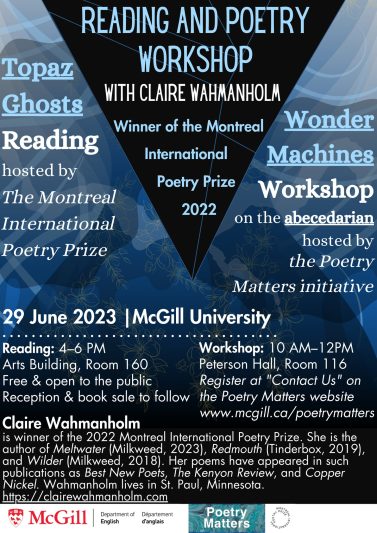 Later, Claire Wahmanholm will give a reading of her work, “Topaz Ghosts” at McGill through the Montreal International Poetry Prize.