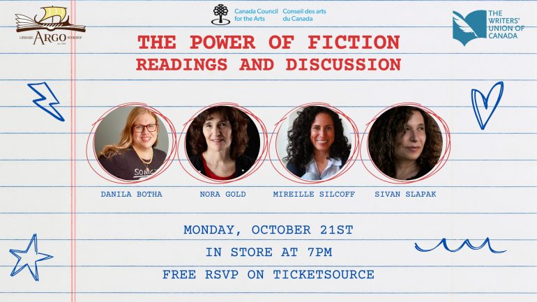 Please join Argo Books for an evening with Danila Botha, Nora Gold, Mireille Silcoff and Sivan Slapak, where they will be performing readings of their work, followed by a discussion about their craft, common themes and personal inspiration. There will also be an open Q&A and time for book signing. This event is free, but space is limited, so please RSVP on TicketSource.