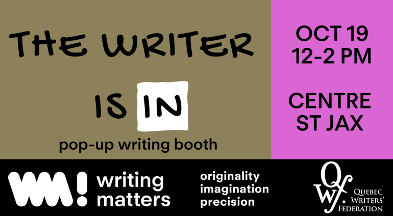 On October 19, from 12 to 2 pm, we’ll be outside Centre St. Jax on Sainte-Catherine Street with writers from QWF’s Hire a Writer Directory, who will be offering free writing services to passers-by. They’ll be there to take on any writing request you may have, from business letters to love letters and everything in between. Stop by, say hi, and treat yourself to some poetic pampering.