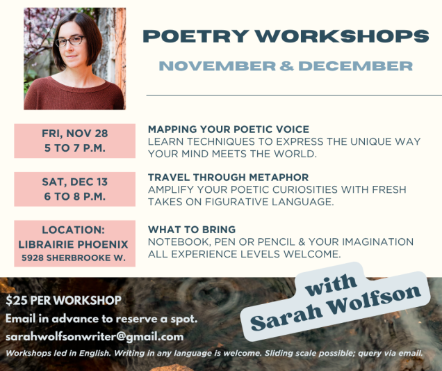 Email sarahwolfsonwriter@gmail.com to reserve your spot in advance. Space is limited.