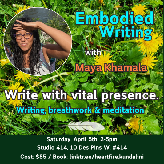 Maya Khamala is a lifelong writer of many stripes. From poetry to grassroots journalism to creative nonfiction, word is her bond. She has collaborated with visual artists at a loss for words, and has worked as a freelance copywriter and editor for close to a decade. She has a shiny little MA in Creative Writing to list among her credentials, and is an emerging novelist to boot. Maya has an extensive background in feminist, anti-racist, climate justice and Indigenous solidarity movements—work that has deeply informed the way she wields words. Aside from being a writer, she is also a Kundalini Yoga teacher offering regular Montreal classes in NDG and the Plateau. She got into Kundalini as a way of healing from childhood trauma and its many lifelong manifestations in her body, as well as to counteract being a writer who sometimes forgets to step away from the keyboard…and simply breathe.