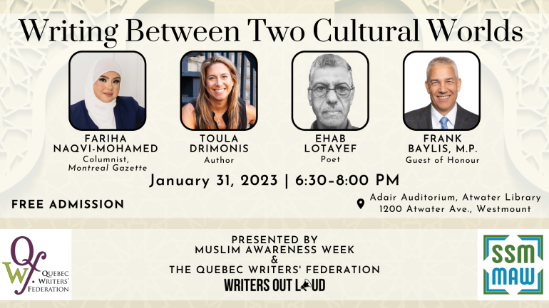 The Quebec Writers’ Federation and Muslim Awareness Week (MAW—2023) invite you to a special panel featuring authors Toula Drimonis and Ehab Lotayef in conversation with Montreal Gazette columnist Fariha Naqvi-Mohamed. Featuring Guest of Honour Frank Baylis, M.P.