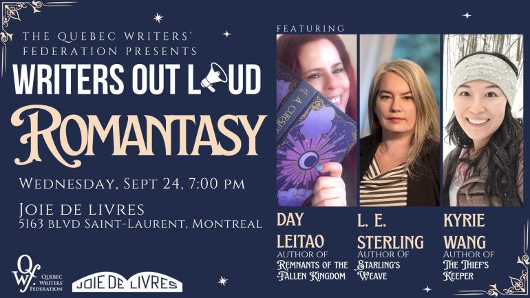 Join us for Writers Out Loud: Romantasy (“Romantic Fantasy”). Three talented Montreal-based authors—Day Leitao (Remnants of the Fallen Kingdom Series), L.E. Sterling (Starling’s Weave), and Kyrie Wang (The Enemy’s Keeper Series)—sit down to discuss their writing, how they got started in the world of romantasy, and why it’s such an exciting genre to be working in today. Discover the fantastical worlds, the captivating romances, and the manifold subgenres that make romantasy the world’s latest breakout book genre.