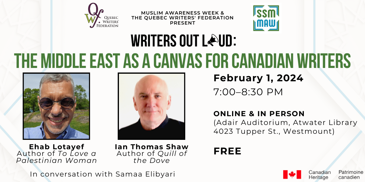 Organized by Muslim Awareness Week and QWF, this free event will feature writers Ehab Lotayef (To Love a Palestinian Woman) and Ian Thomas Shaw (Quill of the Dove) discussing how the region and concept of “the Middle East” has influenced their work. Moderated by CKUT Community Radio Reporter Samaa Elibyari.