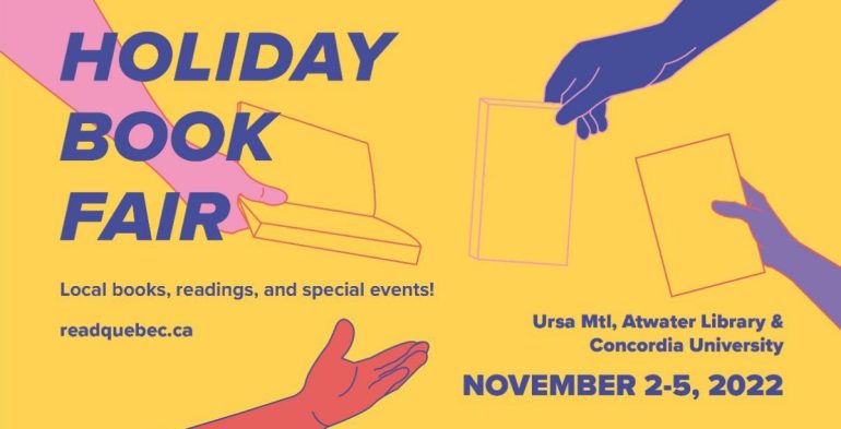 The Holiday Book Fair is open Friday and Saturday November 4-5, 2022, from 11 am – 5 pm, in the Atrium of the McConnell Building at Concordia University, 1400 De Maisonneuve Boulevard W.. The building is accessible directly from Guy metro and fully accessible to wheelchairs and strollers.