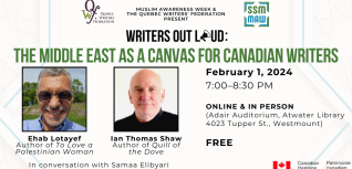 Join us for Writers Out Loud: The Middle East As a Canvas for Canadian Writers. Featuring writers Ehab Lotayef and Ian Thomas Shaw in conversation with Samaa Elibyari.