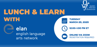 The Quebec Writers’ Federation is excited to host PLR Program Manager Peter Schneider and PLR Program Analyst Lori Knoll for our next Lunch and Learn. They will give an overview of the program, including who is eligible, how payments work, and what has recently changed in the registration process.