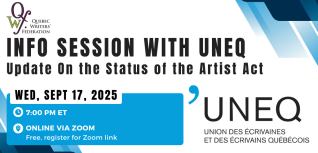 In partnership with QWF, the Union des écrivaines et des écrivains québécois (UNEQ) will be leading a virtual information session in English for writers to learn more about UNEQ.