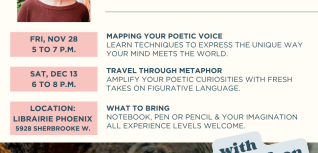In this generative workshop, we will consider factors that contribute to poetic voice. In doing so, we will see that our voices are not waiting to be found somewhere outside of ourselves. Rather, they call us to listen deeply to who we are and how we experience the world. You can expect to leave the workshop with tools for thinking about what makes your poetic expression unique. The workshop is open to writers of all levels, but some basic experience with poetry writing is recommended. Email sarahwolfsonwriter@gmail.com to reserve your spot in advance. Space is limited.
