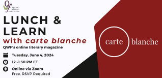 In this Lunch and Learn session, Editor-in-Chief Greg Santos and Creative Nonfiction Editor Caite McNeil will present an overview of carte blanche, QWF’s online literary magazine. Join Greg and Caite as they explain the submission, selection, editorial, and publication processes involved in running carte blanche.