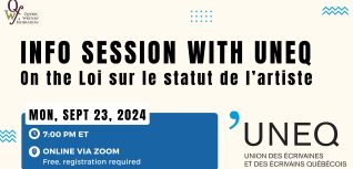In partnership with QWF, the Union des écrivaines et des écrivains québécois (UNEQ) will be leading a virtual information session in English for writers to learn more about the Loi sur le statut de l’artiste, which governs professional working conditions for writers and other literary artists.
