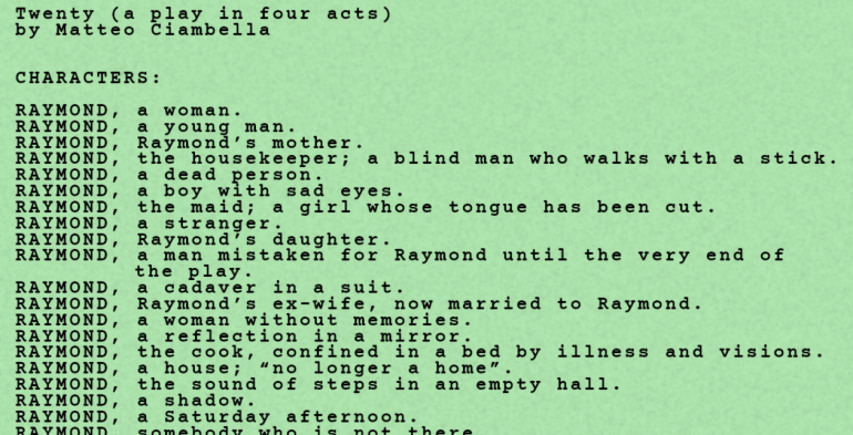 I first wrote Twenty as sort of riddle, about a director who has to stage a play in which all characters share the same name. A few years later I came across the riddle, and decided to actually write the cast of characters for the play in question. As I did it, I realized I was weaving those names together in a cumulative sequence, and some mystery was moving behind them. I was intrigued.